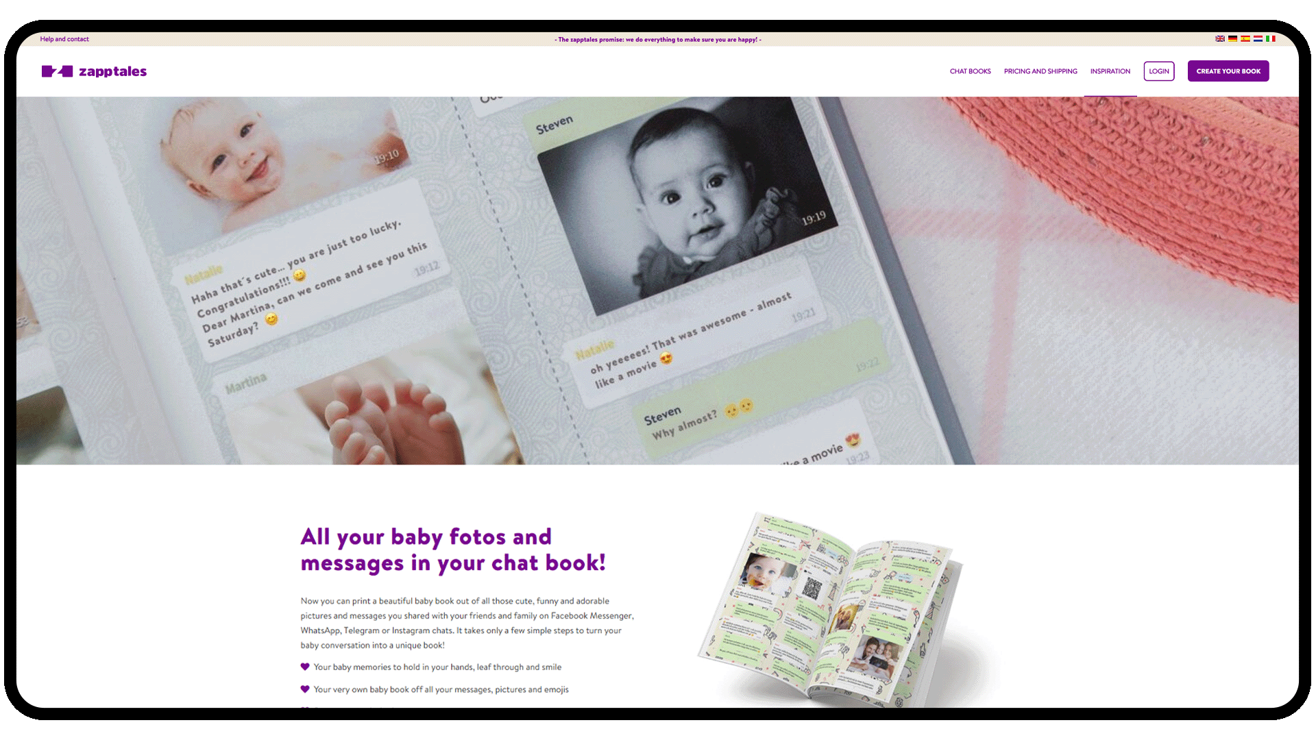 Zapptales es una startup basada en Munich, fundada en 2015, cuyo objetivo inicial era el de dar a sus clientes la posibilidad de convertir sus chats de WhatsApp en libros personalizables.